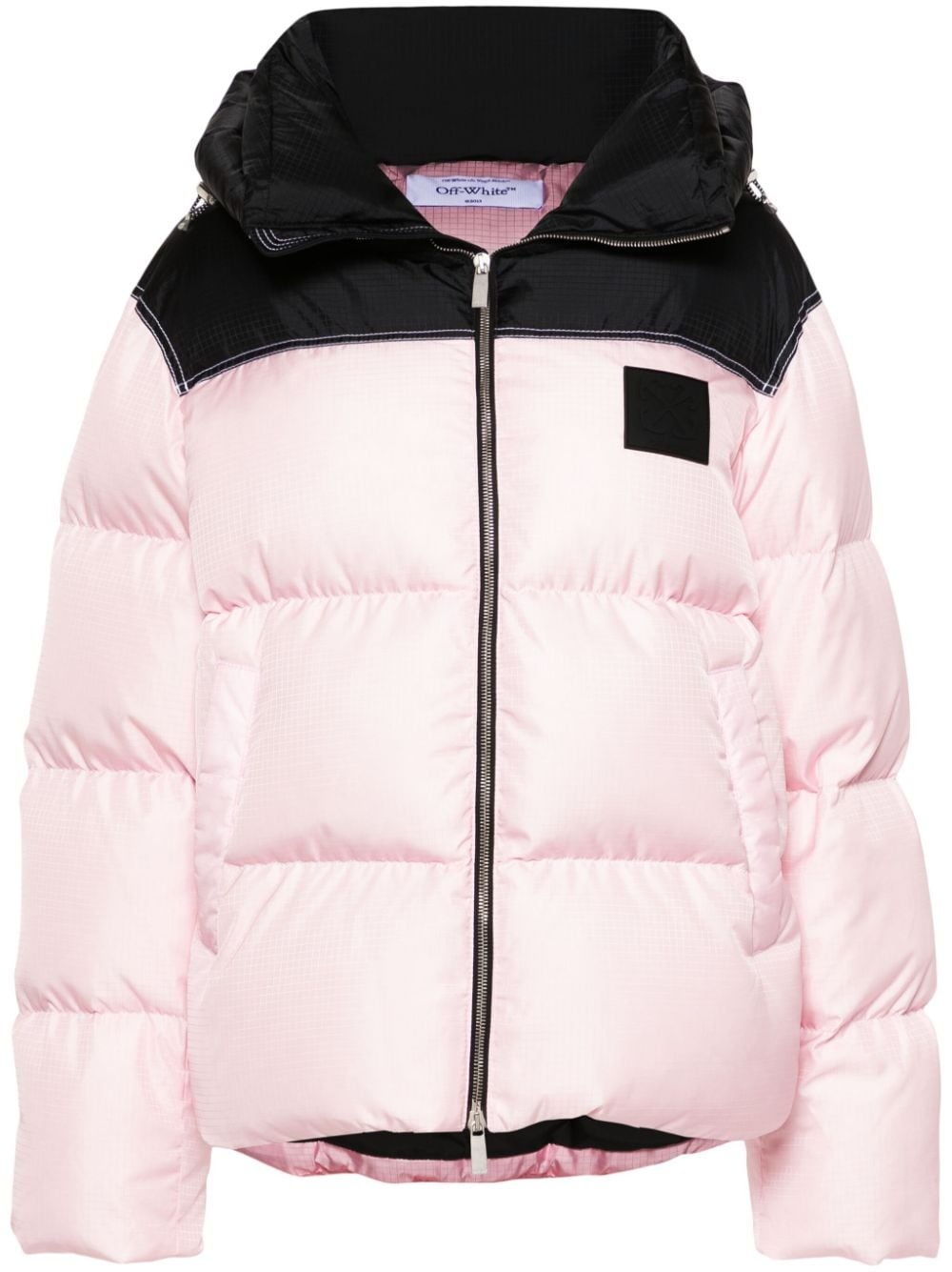 logo-applique puffer jacket Highlights - Light pink/black - Ripstop texture - Padded design - Down filling blend - Quilted - Drawstring hood - Contrasting panel detail - Long sleeves - Elasticated cuffs - Applique logo - Two side welt pockets - Straight hem - Front zip fastening Made in Italy Composition Outer: Polyamide 100% Lining: Polyester 100%, Down 90%, Feather 10% SIZE & FIT Model measurements Height 5 ft 10 in(1.78 m) Bust/Chest 31.49 in(80 cm) Hips 37 in(94 cm) Waist 23.62 in(60 cm) FittingInformation Designed to be unstructured, offering a loose fit throughout The internal drawstring at the hem allows for fitted preferences Made from a padded non-stretch fabric, giving it no natural elasticity This piece fits true to size – take your usual size Washing instructions Machine Wash