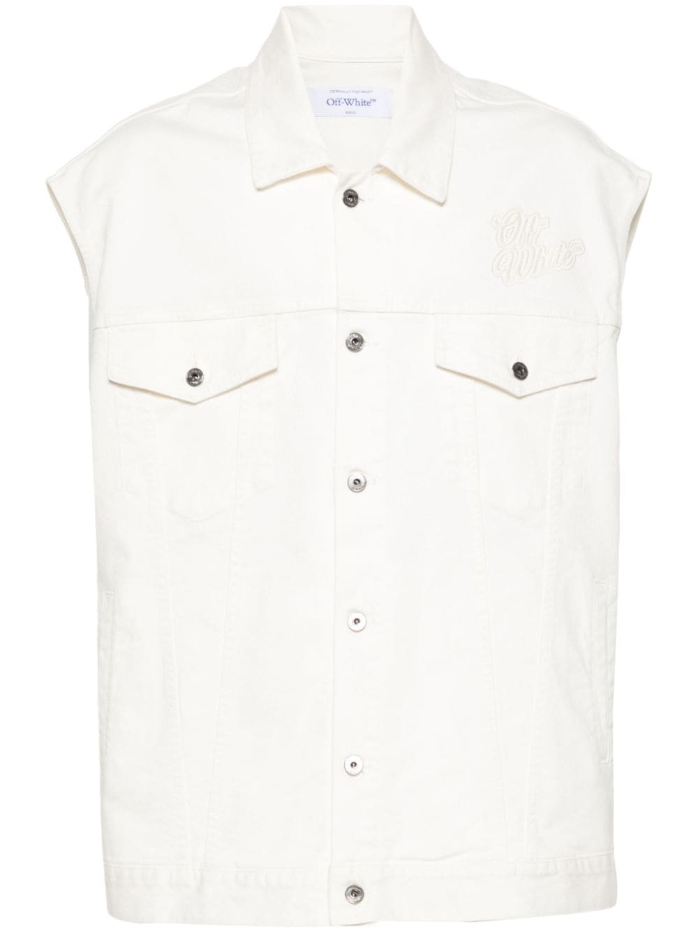 logo-embroidered denim gilet Highlights - White - Cotton - Denim - Vertical seamed - Embroidered logo at the chest - Logo patch to the rear - Classic collar - Front button fastening - Sleeveless - Two button-fastening chest pockets - Straight hem Made in Italy Composition Lining: Cotton 100% Outer: Cotton 98%, Elastane 2% SIZE & FIT Model measurements Height 6 ft 2 in(1.87 m) Bust/Chest 37 in(94 cm) Hips 33.85 in(86 cm) Waist 27.95 in(71 cm) FittingInformation Designed to be unstructured, offering a loose fit throughout Made from a midweight stretch fabric, this piece offers elasticity and flexibility when worn This piece fits true to size – take your usual size