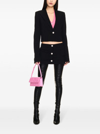 logo-embroidered mini skirt Highlights - Black - Twill weave - Embroidered logo to the side - Raw-cut hem - Crystal-embellished buttons - Mid-rise - Front button fastening - Thigh-length - Straight hem - Two front patch pockets Made in Italy Composition Viscose 98%, Spandex/Elastane 2%