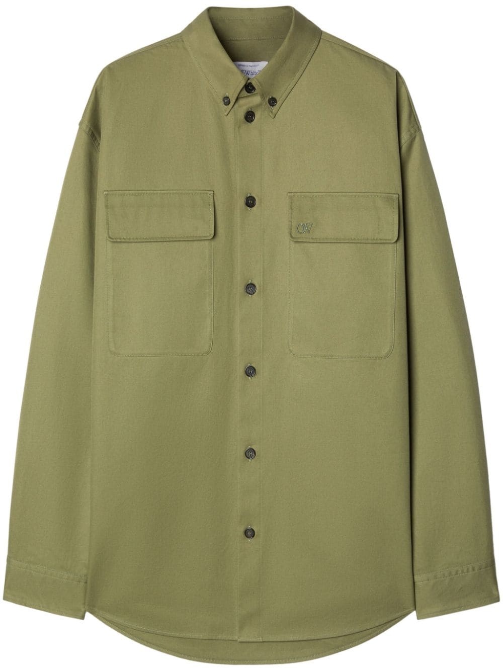 logo-embroidered shirt jacket Highlights - Military green - Organic cotton - Gabardine weave - Embroidered logo at the chest - Button-down collar - Front button fastening - Long sleeves - Buttoned cuffs - Two chest flap pockets - Curved hem Made in Italy Composition Organic Cotton 100%