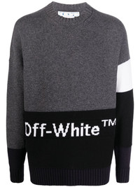 logo-intarsia jumper logo-intarsia jumper from OFF-WHITE featuring black/grey, virgin wool, ribbed detailing, long sleeves, straight hem, two-tone design, colour-block design and straight hem. Made in Italy Composition Virgin Wool 100% SIZE & FIT Model measurements Height 6 ft 2 in(1.89 m) Bust/Chest 37 in(94 cm) Hips 37 in(94 cm) Waist 28.93 in(73.5 cm) FittingInformation This piece fits true to size. We recommend you get your regular size Cut for a loose fit Made with a mid-weight fabric Washing instructions Machine Wash