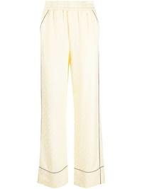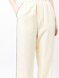 logo-jacquard elasticated trousers A subtle logo jacquard motif adorns the entirety of these silk-cotton blend Off-White trousers. They fall to a straight leg, boast an elasticated waistband and are finished with contrast piping, reminiscent of relaxed pyjama styles. Highlights - Light yellow - Silk-cotton blend - Jacquard logo motif - Piped-trim detailing - Elasticated waistband - Two side slash pockets - Rear patch pocket - Straight leg Made in Italy Composition Silk 56%, Cotton 44% SIZE & FIT Model measurements Height 5 ft 9 in(1.76 m) Bust/Chest 31.1 in(79 cm) Hips 35.03 in(89 cm) Waist 24.4 in(62 cm) FittingInformation Designed for a straight-leg fit, these trousers allow for a close fit at the waist and an unrestricted, comfortable fit over the leg The elasticated waist allows for a comfortable fit Made from a lightweight non-stretch fabric This piece fits true to size – take your usual size Washing instructions Dry Clean Only