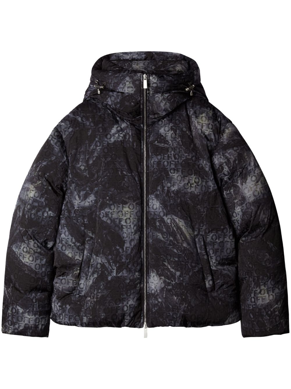 logo-jacquard puffer jacket Off-White is known for its streetwear aesthetic and off-duty style, as is illustrated with this oversized puffer jacket. Characterised by the logo-jacquard motif that decorates its entirety, the padded design is complete with a high neck and large drawstring hood for added protection against the elements. Highlights - Black - Jacquard logo motif - Drawstring hood - High neck - Long sleeves - Front zip fastening - Two diagonal pockets to the sides - Rear zip-fastening pocket - Straight hem Made in Italy Composition Lining: Polyester 100% Polyamide 100% SIZE & FIT FittingInformation Designed to be unstructured, offering a loose fit throughout