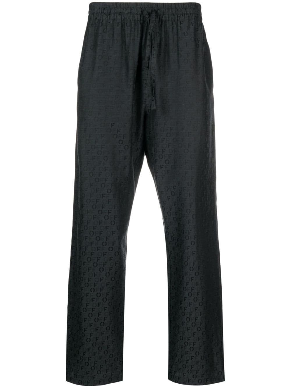 logo-jacquard silk-blend trousers Fusing relaxed and sophisticated, these Off-White trousers boast a drawstring straight silhouette that is realised in a soft silk blend. A tonal Off Stamp jacquard pattern adorns the pair, in a display of the label's more toned-down approach to branding. Highlights - Black - Cotton-silk blend - Jacquard logo motif - Elasticated drawstring waistband - Straight leg - Two side inset pockets - Rear patch pocket Made in Italy Composition Cotton 52%, Silk 48% SIZE & FIT Model measurements Height 6 ft 1 in(1.85 m) Bust/Chest 35.82 in(91 cm) Hips 37.79 in(96 cm) Waist 29.13 in(74 cm) FittingInformation Designed for a relaxed straight leg, allowing a comfortable and loose fit over the leg Adjust this piece’s waistband to your preference using the drawstring Made from a lightweight non-stretch fabric This piece fits true to size – take your usual size