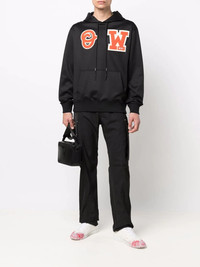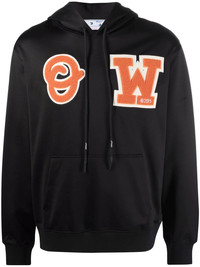logo-patch hoodie A collegiate-inspired design, this hoodie is adorned with Off-White's logo patches at the chest in a contrasting orange hue. It is crafted from an organic cotton blend and finished with a drawstring hood and front pouch pocket. Highlights - Black - Organic cotton-blend - Drawstring hood - Long sleeves - Front pouch pocket - Logo patch to the front Made in Italy Composition Recycled Nylon 59%, Organic Cotton 38%, Elastane 3% SIZE & FIT Model measurements Height 6 ft 1 in(1.85 m) Bust/Chest 35.82 in(91 cm) Hips 37.79 in(96 cm) Waist 29.13 in(74 cm) FittingInformation This piece fits true to size. We recommend you get your regular size Cut for a loose fit Made with a mid-weight stretch fabric Washing instructions Machine Wash