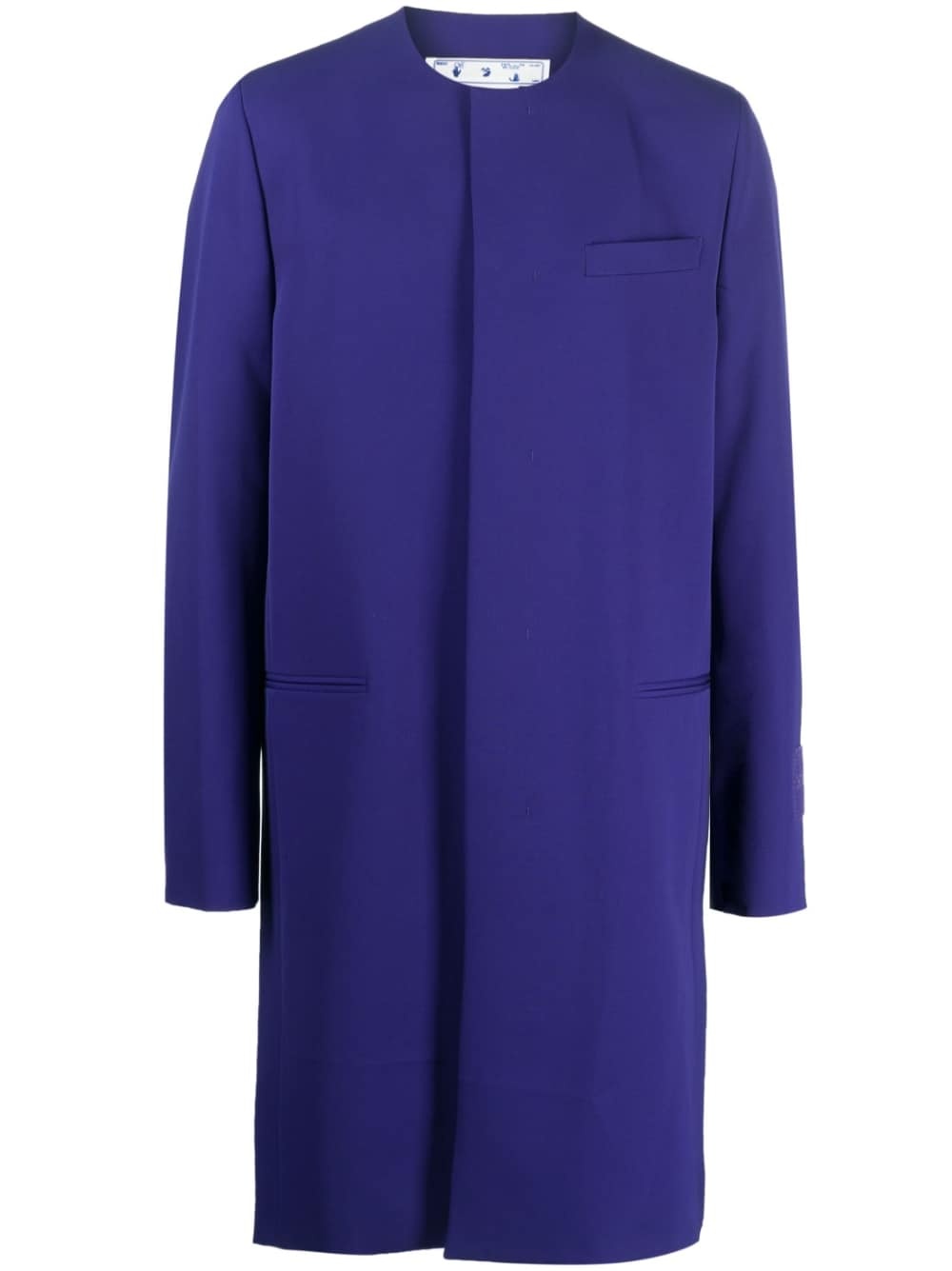 logo-patch single-breasted coat Off-White's bold aesthetic is highlighted in this single-breasted coat, imagined in a deep purple hue for SS23. The garment is subtly adorned with a tonal logo patch for a signature touch. Highlights - Electric purple - Wool - Logo patch at the sleeve - Round neck - Concealed front fastening - Long sleeves - Knee-length - Straight hem Made in Italy Composition Outer: Wool 100% Lining: Viscose 100%, Cotton 100% SIZE & FIT Model measurements Height 6 ft 2 in(1.88 m) Bust/Chest 36.61 in(93 cm) Hips 37.79 in(96 cm) Waist 28.74 in(73 cm) FittingInformation Designed to be unstructured, offering a loose fit throughout The vented hem offers movement at the rear Made from a midweight non-stretch fabric This piece fits true to size – take your usual size