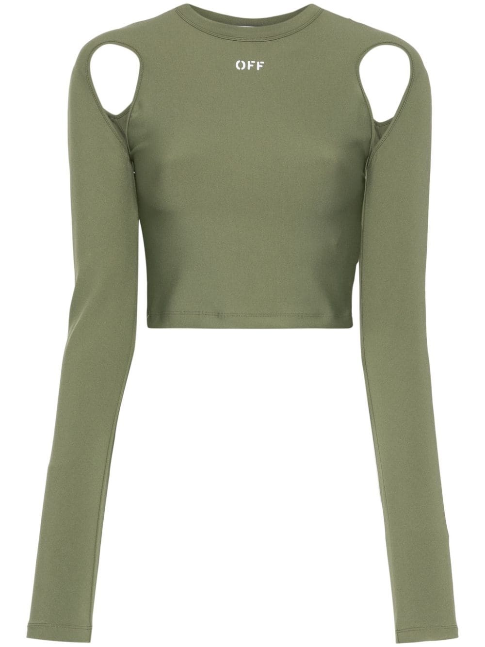 logo-print cropped top Highlights - Khaki - Soft scuba jersey - Round neck - Logo print to the front - Cut-out sleeves - Long sleeves - Straight hem - Cropped Made in Italy Composition Polyamide 86%, Elastane 14% SIZE & FIT Model measurements Height 5 ft 9 in(1.75 m) Bust/Chest 31.88 in(81 cm) Hips 34.64 in(88 cm) Waist 24.01 in(61 cm) FittingInformation Designed for a close fit throughout Cropped in length Made from a midweight stretch fabric, this piece offers elasticity and flexibility when worn This piece fits true to size – take your usual size