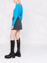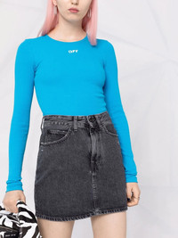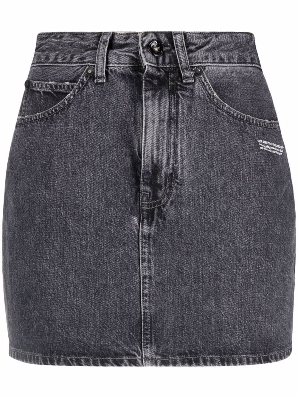logo-print denim skirt Off-White is known for adding a streetwear twist to classic wardrobe staples. A fine example is this denim mini skirt which come crafted from soft dark grey cotton and features a miniature logo print and patch to the rear for a final stamp. Made in Italy Composition Outer: Cotton 100% Lining: Polyester 65%, Cotton 35% SIZE & FIT Model measurements Height 5 ft 9 in(1.75 m) Bust/Chest 31.49 in(80 cm) Hips 34.64 in(88 cm) Waist 24.01 in(61 cm) FittingInformation This piece fits true to size. We recommend you get your regular size Cut for a slim fit Made with a mid-weight non-stretch fabric Washing instructions Machine Wash