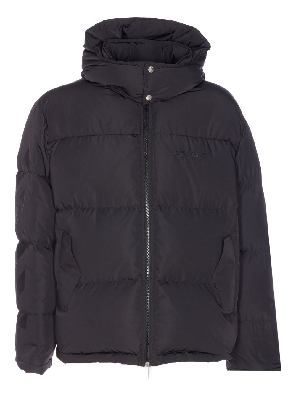 logo-print down jacket Highlights - Black - Logo print on the back - Removable hood - Frontal zip closure - Long sleeves Made in Italy Composition Polyester 100%, Down 90%, Feather 10% Washing instructions Read Manufacturer Guidelines