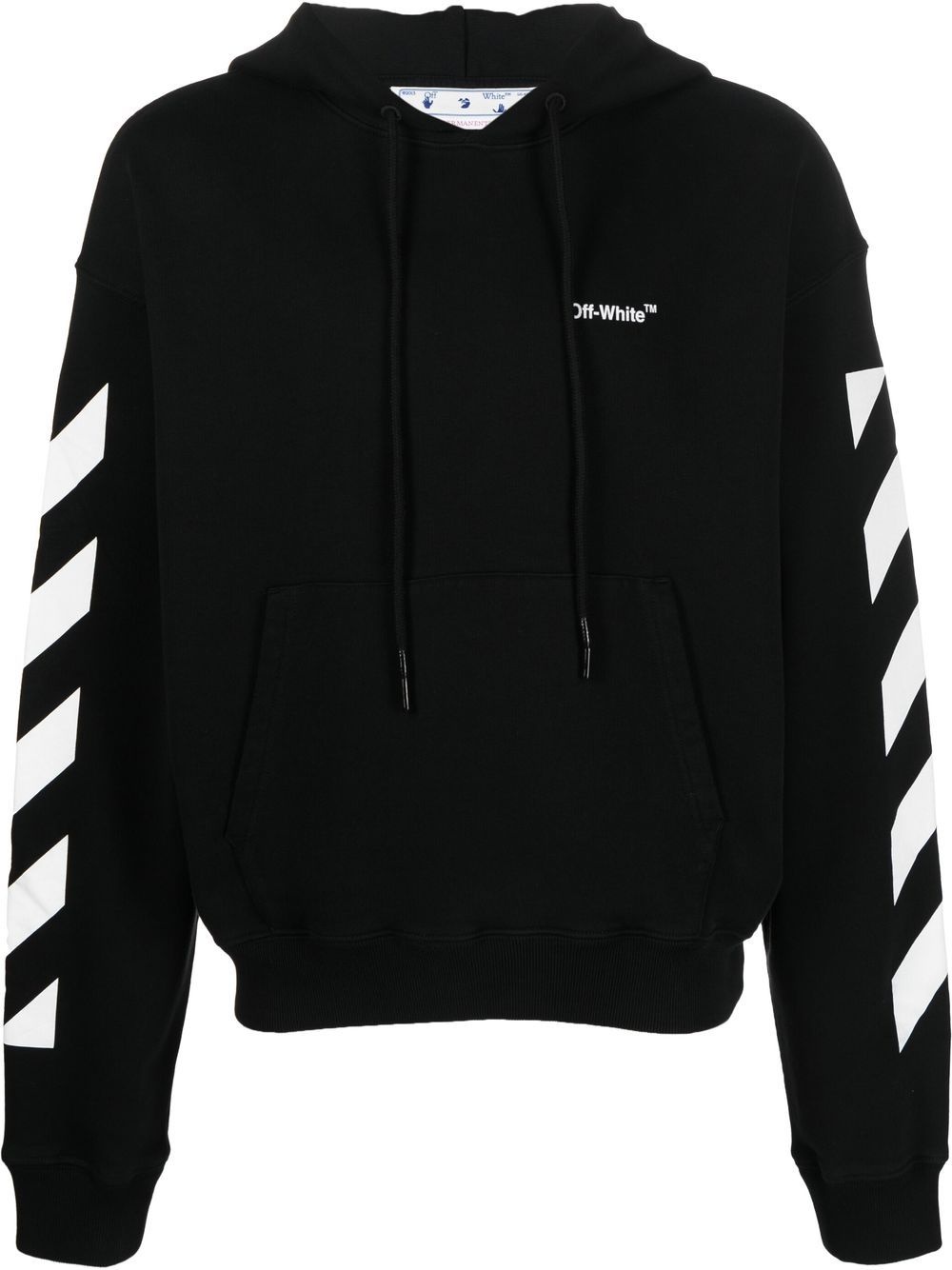 logo-print drawstring hoodie Off-White uses signature elements of branding such as logo-print detailing and the diagonal-stripe print on this drawstring hoodie, making the garment instantly recognisable as the brand. Paired with a refined two-tone palette, the brand's minimalist approach to design is also highlighted. Imported Composition Cotton 100% SIZE & FIT Model measurements Height 6 ft 2 in(1.87 m) Bust/Chest 38.18 in(97 cm) Hips 36.61 in(93 cm) Waist 29.13 in(74 cm) Measurement CHEST 45.66 in(116 cm) SLEEVE LENGTH 25.59 in(65 cm) LENGTH 22.83 in(58 cm) FittingInformation This piece fits true to size. We recommend you get your regular size Cut for a relaxed fit Made with a mid-weight fabric Washing instructions Machine Wash