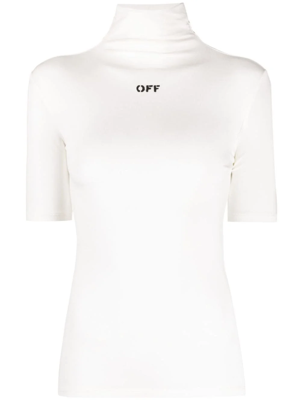 logo-print high-neck T-shirt Cut to a sleek roll-neck silhouette, this Off-White T-shirt is simply embellished with the iconic logo at the front, offering an instantly recognisable finish. Highlights - White - Stretch-design - Logo print to the front - High neck - Short sleeves - Straight hem Made in Italy Composition Viscose 95%, Spandex/Elastane 5% Washing instructions Hand Wash
