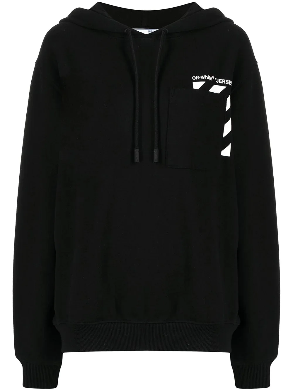 logo print hoodie The diagonal stripe and self-explanatory quotation mark slogans have become signature motifs for the Off-White brand. Both feature here at the chest of this classic hoodie alongside the contrasting trademark branding. Imported Composition Cotton 95%, Elastane 5% Washing instructions Machine Wash