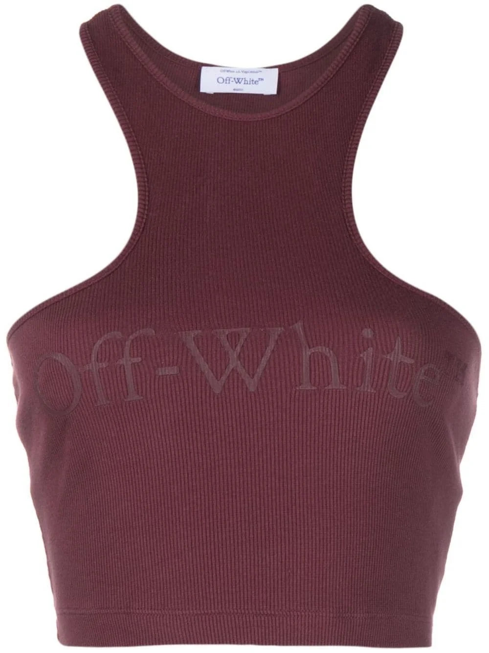 logo-print ribbed-knit racerback top Crafted from a ribbed knit, this burgundy Off-White top is cut to a racerback silhouette, drawing inspiration from activewear. A tonal logo to the front adds a subtle branding finish. Highlights - Burgundy - Stretch-cotton - Ribbed knit - Logo print to the front - Halterneck - Racerback - Straight hem - Cropped Imported Composition Cotton 96%, Elastane 4% Washing instructions Hand Wash