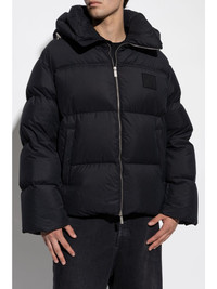 logo puffer jacket Highlights - Black - Front zip fastening - Classic hood - Long sleeves - Logo patch to the front - Padded panels - Two side slit pockets Imported Composition Polyester 100%