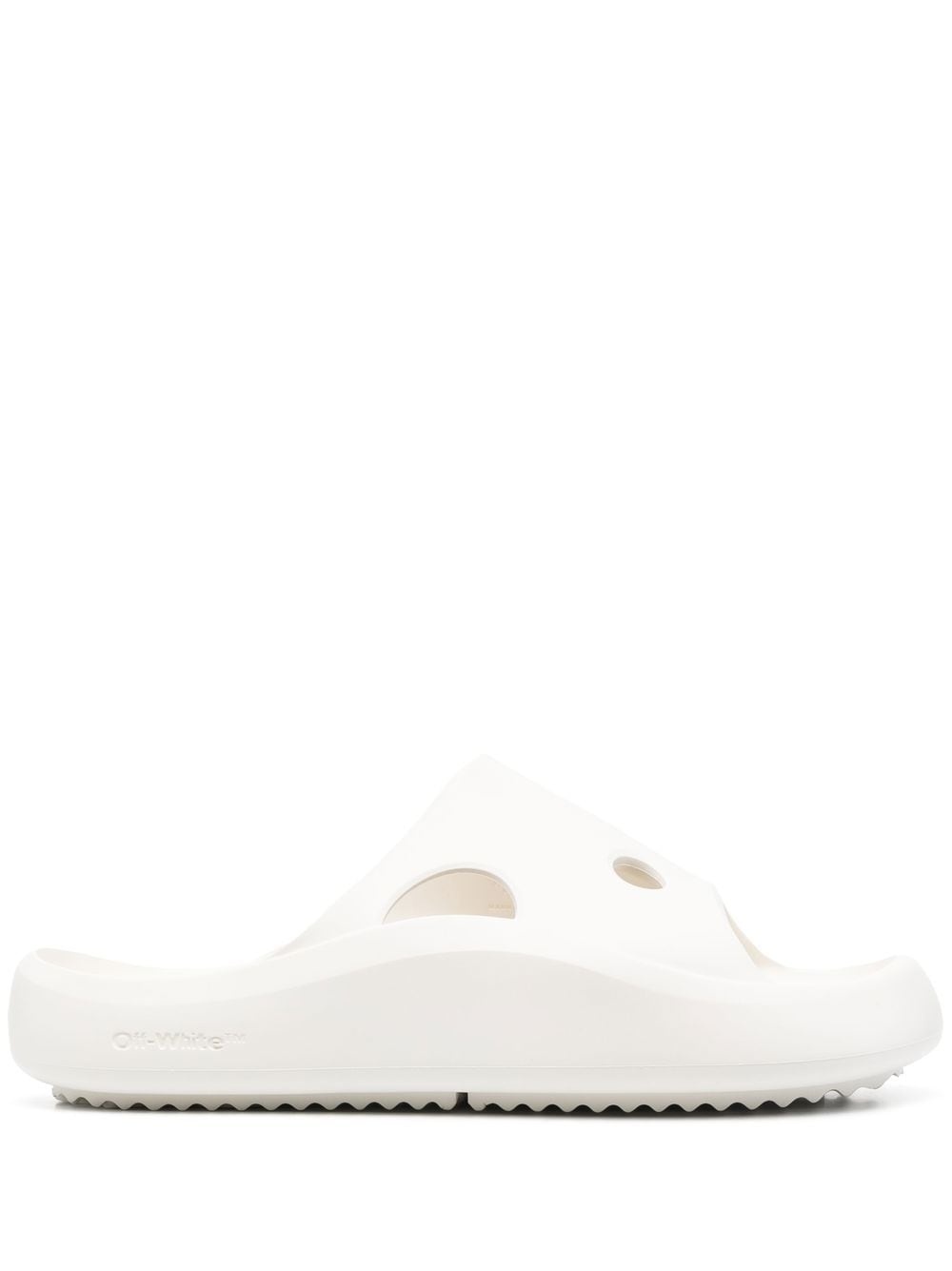 Meteor cut-out slides These slides from Off-White are made recognisable by the brand's signature Meteor cut-out detailing throughout, an iconic style from the street-style label. Highlights - White - Signature meteor cut-out detailing - Open toe - Slip-on style - Flat rubber sole Made in Italy Composition Lining: Polyethylene vinyl acetate (PEVA) 100% Outer: Polyethylene vinyl acetate (PEVA) 100% Sole: Polyethylene vinyl acetate (PEVA) 100% SIZE & FIT Measurement HEEL 1.57 in(4 cm) Sole height 1.37 in(3.5 cm)