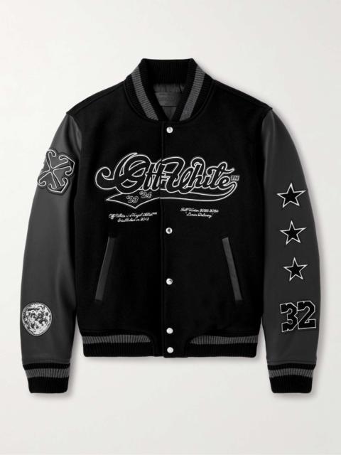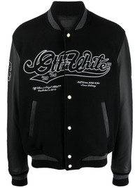 Moon embroidered bomber jacket Solar influences permeate Off-White's AW23 collection, as is evidenced by this panelled bomber jacket. Featuring the brand's name embroidered to the front, moon motifs decorate the sleeves and rear. Highlights - Black/white - Leather trim - Embroidered logo to the front - Patch detail - Ribbed band collar - Front press-stud fastening - Side pouch pockets - Long sleeves - Straight hem - Ribbed trim Imported Composition Leather 100%, Virgin Wool 75%, Polyamide 25% Lining: Viscose 100%, Cotton 100%, Polyester 100% Washing instructions Specialist Cleaning