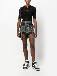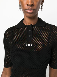 OFF-logo open-knit polo shirt Showcasing sportswear-inspired minimalism, Off-White presents this black top which is characterised by its open-knit construction. Centred at the chest is an intarsia OFF logo. Highlights - Black - Open knit - Intarsia-knit logo - Spread collar - Front button placket - Short sleeves - Straight hem Made in Italy Composition Viscose 70%, Polyester 30% Washing instructions Dry Clean Only