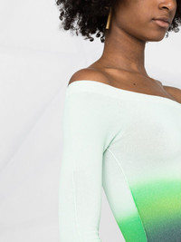 off-shoulder gradient style top Experimental knitwear is presented by the streetwear-inspired label Off-White. Hues of green and blue help distinguish this off-shoulder top, whilst contemporary flair is incorporated with its cropped length. Made in Italy Composition Viscose 83%, Polyester 17% SIZE & FIT Model measurements Height 5 ft 10 in(1.78 m) Bust/Chest 29.52 in(75 cm) Hips 35.03 in(89 cm) Waist 22.83 in(58 cm) FittingInformation This piece fits true to size. We recommend you get your regular size Cut for a close fit Made with a mid-weight fabric Washing instructions Hand Wash