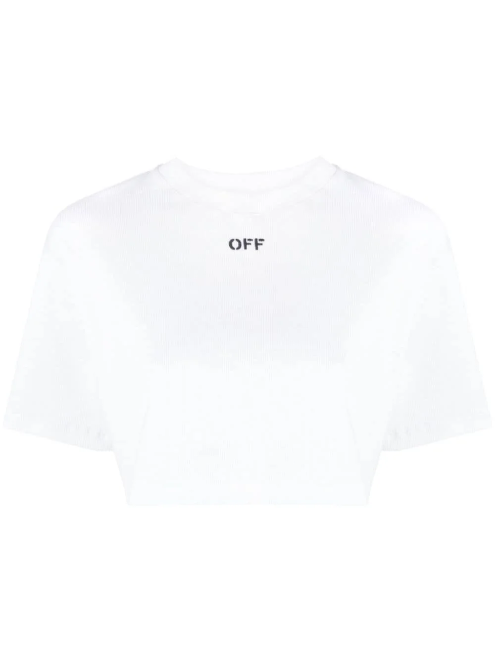 Off-Stamp cropped T-shirt Showcasing Off-White's affinity for effortless casuals, this ribbed T-shirt boasts a contemporary cropped silhouette whilst a logo print to the front adds an instantly recognisable touch. Highlights - White - Stretch-cotton - Fine ribbed - Logo print to the front - Crew neck - Drop shoulder - Short sleeves - Straight hem - Cropped Made in Italy Composition Cotton 98%, Elastane 2% SIZE & FIT Model measurements Height 5 ft 10 in(1.78 m) Bust/Chest 31.49 in(80 cm) Hips 37 in(94 cm) Waist 23.62 in(60 cm) FittingInformation Designed for a relaxed fit, this piece allows for comfort and movement when worn Cropped in length Made from a midweight stretch fabric, this piece offers elasticity and flexibility when worn This piece fits true to size – take your usual size Measurement SLEEVE LENGTH 8.66 in(22 cm) LENGTH 15.35 in(39 cm) BUST 43.3 in(110 cm) Washing instructions Machine Wash
