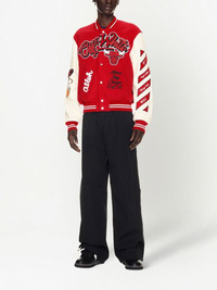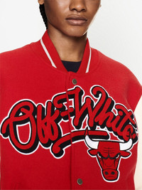 Off-White™ c/o Chicago Bulls Red Varsity Off-White™ celebrates Virgil Abloh’s passion for basketball and his hometown by joining forces with the legendary Chicago Bulls to launch a capsule collection available exclusively on Off-White’s site and FARFETCH. Debuting on the day the Bulls play the Detroit Pistons in Paris in January 2023 – a momentous event in the sporting calendar – it presents collegiate styles underpinned by an irreverent spirit. Made in Italy Composition Outer: Virgin Wool 69%, Nylon 26%, Cashmere 5% Lining: Viscose 53%, Cupro 47% SIZE & FIT FittingInformation This piece is unisex. Please take care when selecting your size Designed for a loose fit for men and an oversized fit for women