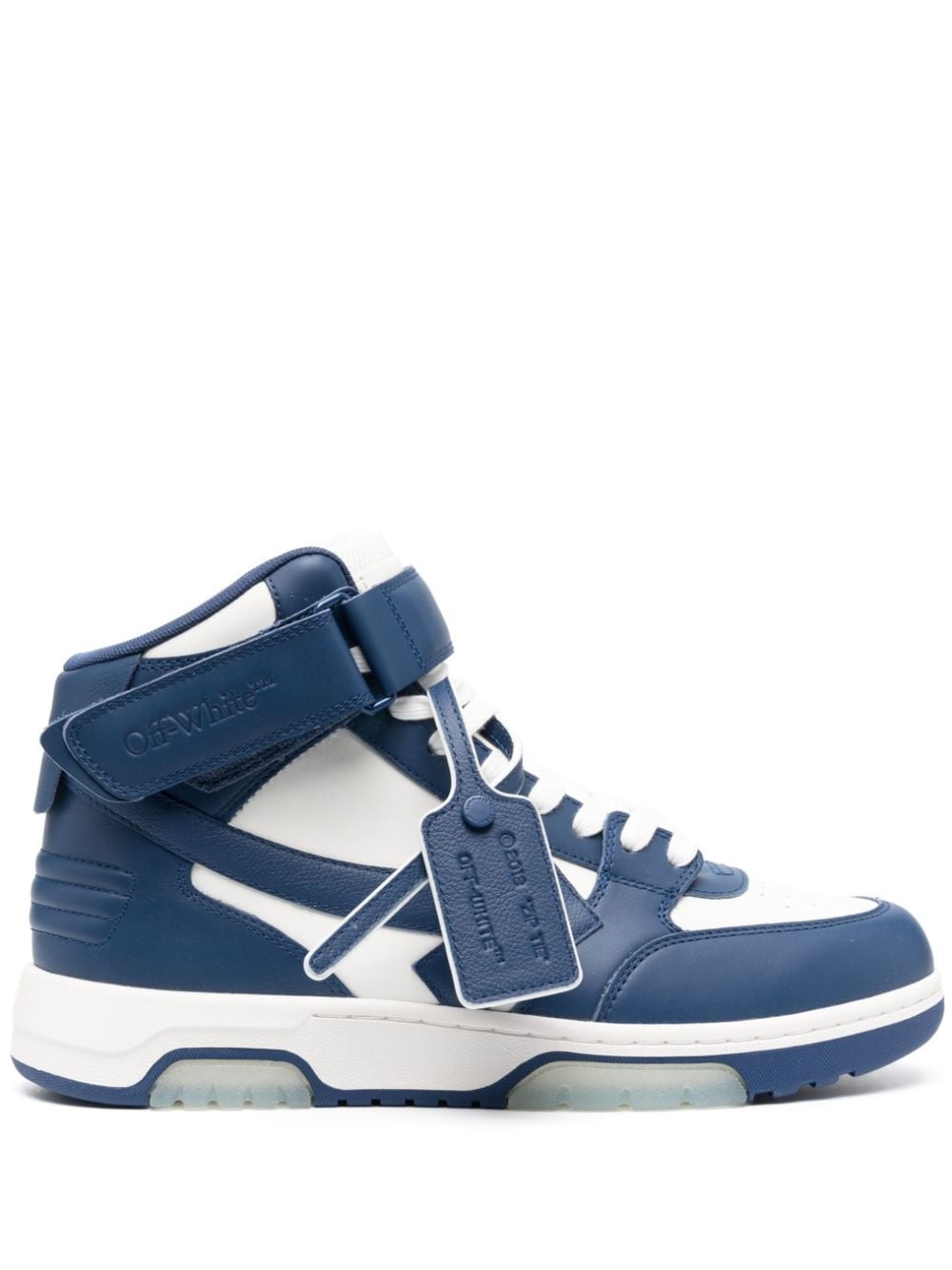 Out Of Office mid-top sneakers Off-White's signature Out Of Office sneakers are distinguished by the iconic Arrows motif and removable Zip Tie tag. The familiar silhouette is reimagined here in a white and blue colourway. Highlights - Blue/white - Leather - Two-tone design - Signature arrows motif - Signature zip tie tag - Round toe - Perforated toebox - Front lace-up fastening - Ankle touch-strap fastening - Branded heel counter - Branded insole - Flat rubber sole - Due to the dyeing process used, this product must not come into contact with water. Imported Composition Outer: Polyester 100% Sole: Rubber 100% Lining: Fabric 100% SIZE & FIT Measurement HEEL 1.37 in(3.5 cm) HEIGHT 3.93 in(10 cm) Sole height 0.98 in(2.5 cm)