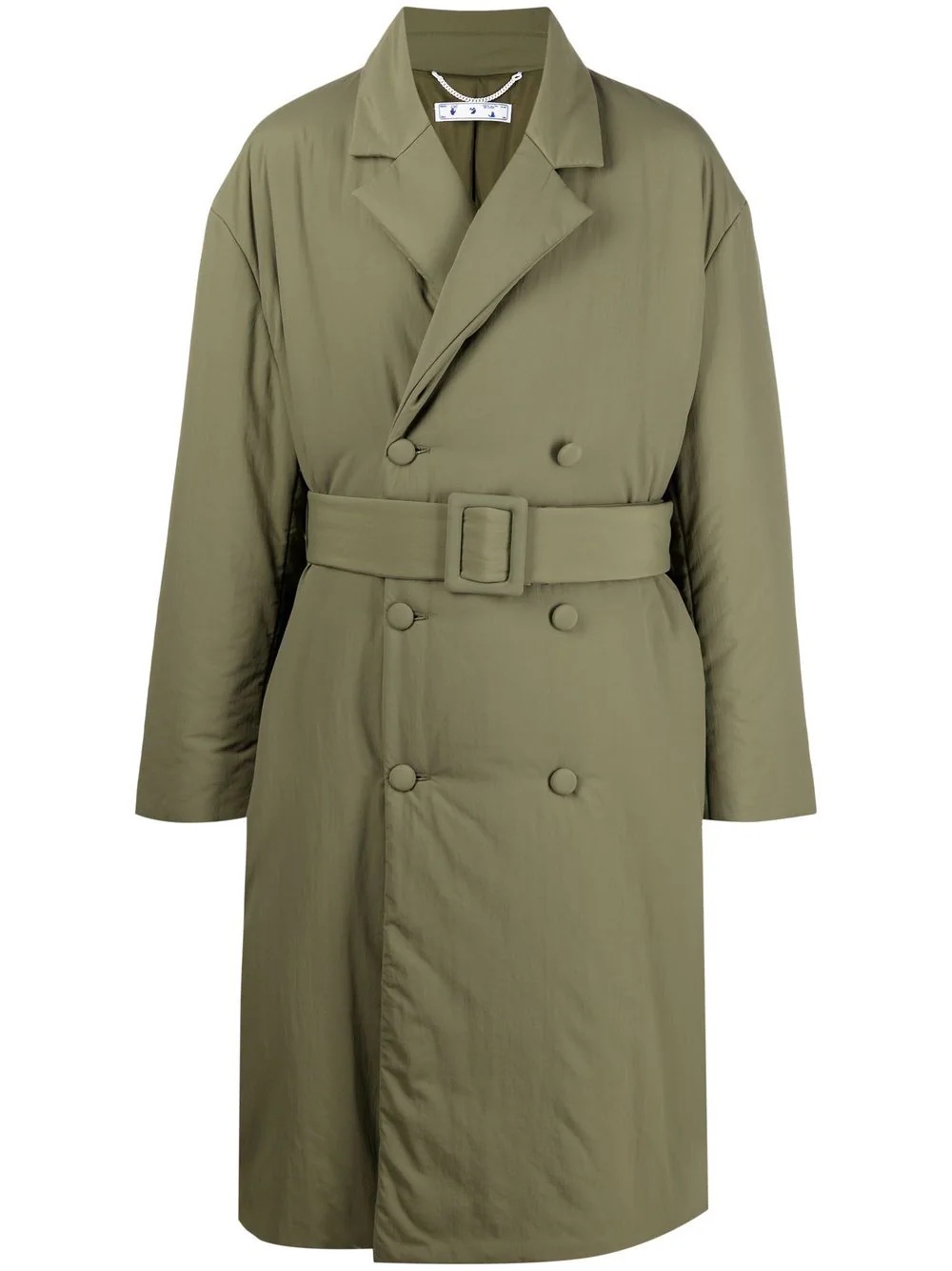 padded double-breasted coat Off-White adds an unexpected twist to this classic olive green coat. Designed with timeless double-breasted front fastening and notched lapels, this piece is punctuated by its distinct padded silhouette, aligned with the label's convention-defying style. Made in Italy Composition Lining: Polyester 100% Outer: Polyamide 100% SIZE & FIT Model measurements Height 6 ft 2 in(1.89 m) Bust/Chest 35.43 in(90 cm) Hips 36.61 in(93 cm) Waist 28.74 in(73 cm) Washing instructions Machine Wash