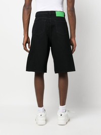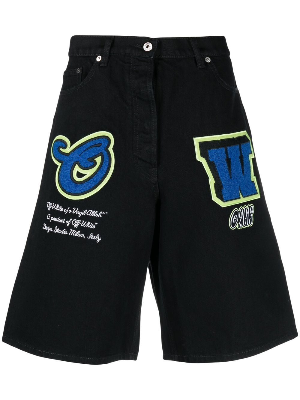 patch wide-leg denim shorts Off-White takes a sporty approach to denim design with these shorts, boldly adorned with varsity patch detailing. The wide-leg pair is finished with a branded embroidery to the front for a signature touch. Made in Italy Composition Cotton 100% SIZE & FIT Model measurements Height 6 ft 2 in(1.88 m) Bust/Chest 36.61 in(93 cm) Hips 35.82 in(91 cm) Waist 27.95 in(71 cm) FittingInformation This piece fits true to size. We recommend you get your regular size Designed for a slim fit at the waist and loose over the leg Made with a mid-weight non-stretch fabric Washing instructions Machine Wash