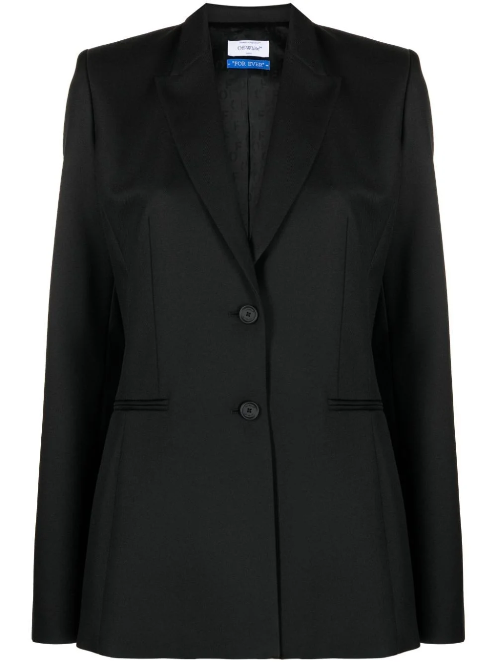 peak-lapels single-breasted blazer Embellished with a contrasting slogan print at the back, this Off-White blazer reflects the brand's bold aesthetic. The single-breasted silhouette is further enhanced with padded shoulders. Highlights - Black - Twill weave - Logo print to the rear - Peak lapels - Front button fastening - Shoulder pads - Long sleeves - Buttoned cuffs - Two front jetted pockets - American rear vent - Straight hem - Logo-jacquard lining Made in Italy Composition Outer: Polyester 100% Lining: Viscose 100%
