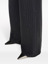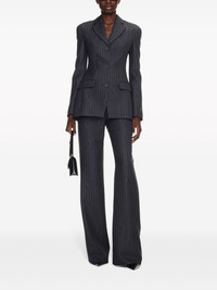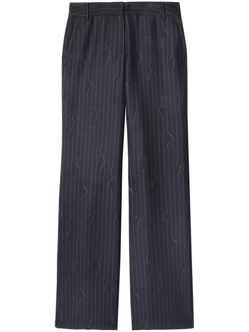 pinstripe-pattern virgin wool-blend trousers Off-White takes cues from classic tailoring styles and cuts these dark grey trousers from a compact blend of suiting virgin wool. The brand's unique take on garments is revealed through an irregular pinstripe pattern. Highlights - Anthracite grey - Virgin wool blend - Tailored design - Irregular pinstripe pattern - Concealed front fastening - Belt loops - Flared - Cotton lining Made in Italy Composition Outer: Virgin Wool 80%, Polyester 20% Lining: Cotton 100% SIZE & FIT Measurement FRONT RISE 11.41 in(29 cm) HIPS 43.3 in(110 cm) WAIST 35.43 in(90 cm) Washing instructions Read Manufacturer Guidelines