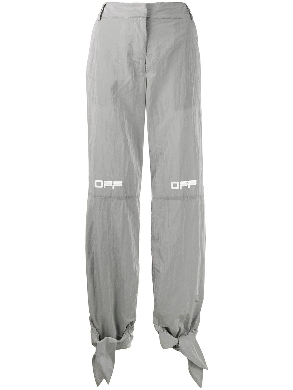 printed logo tie cuffs trousers Casual doesn't need to be boring. Decorated with a white printed "Off" logo to the front, these light grey trousers from Off-White are the perfect pick for a relaxed look that doesn't compromise on style. Featuring a high rise, a waistband with belt loops, a concealed front fastening, side slit pockets, a straight leg, tie cuffs and a regular length. Made in Italy Composition Polyamide 100% SIZE & FIT Model measurements Height 5 ft 9 in(1.76 m) Bust/Chest 29.92 in(76 cm) Hips 33.46 in(85 cm) Waist 24.01 in(61 cm) FittingInformation This piece fits true to size. We recommend you get your regular size Designed to be loose over the leg with a fitted waist and hem Made with a lightweight non-stretch fabric Washing instructions Machine Wash