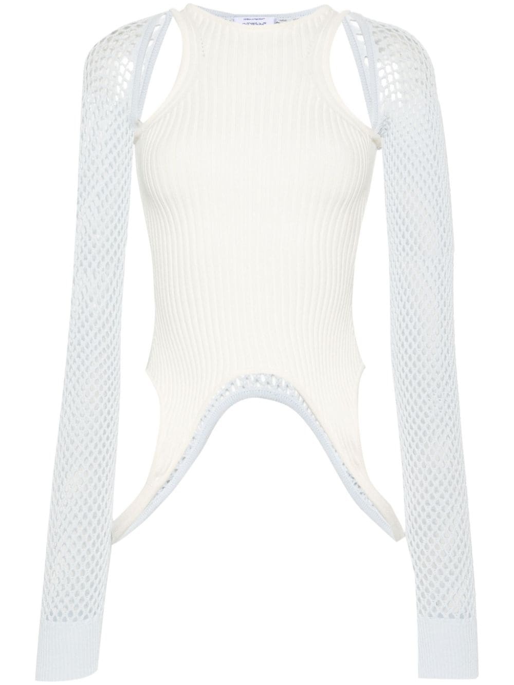 Racerback panelled top Highlights - Arctic white/light blue - Ribbed knit - Open knit to the sleeves and rear - Panelled design - Cut-out detailing - Strap detailing - Signature arrows patch to the rear - Round neck - Extra-long sleeves - Ribbed cuffs - Unlined Made in Italy Composition Viscose 70%, Polyester 30% SIZE & FIT Model measurements Height 5 ft 10 in(1.77 m) Bust/Chest 31.88 in(81 cm) Hips 36.22 in(92 cm) Waist 24.01 in(61 cm) FittingInformation Designed for a close fit throughout Made with a midweight knit, this piece offers some stretch This piece fits true to size – take your usual size Washing instructions Dry Clean Only