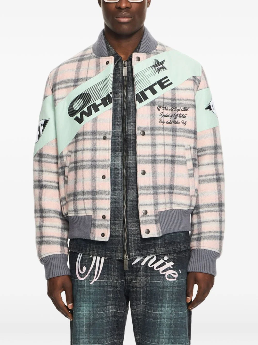 Royal Check bomber jacket Highlights - Mint - Check pattern - Ribbed hem and cuffs - Front button fastening - Patch detail Made in Italy Composition Wool 70%, Polyamide 27%, Polyester 3% Washing instructions Read Manufacturer Guidelines
