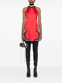 satin mini dress Highlights - Red - Satin finish - Rear hook and eye fastening - Striped ribbed trim - High neck - Raised logo to the front - Sleeveless - Open back - Side slits - Curved hem - Thigh-length Made in Italy Composition Viscose 100%, Polyamide 95%, Elastane 5% SIZE & FIT Model measurements Height 5 ft 11 in(1.8 m) Bust/Chest 31.49 in(80 cm) Hips 36.61 in(93 cm) Waist 24.4 in(62 cm) FittingInformation Designed for a close fit throughout Made from a midweight non-stretch fabric, this piece offers minimal elasticity when worn Washing instructions Dry Clean Only