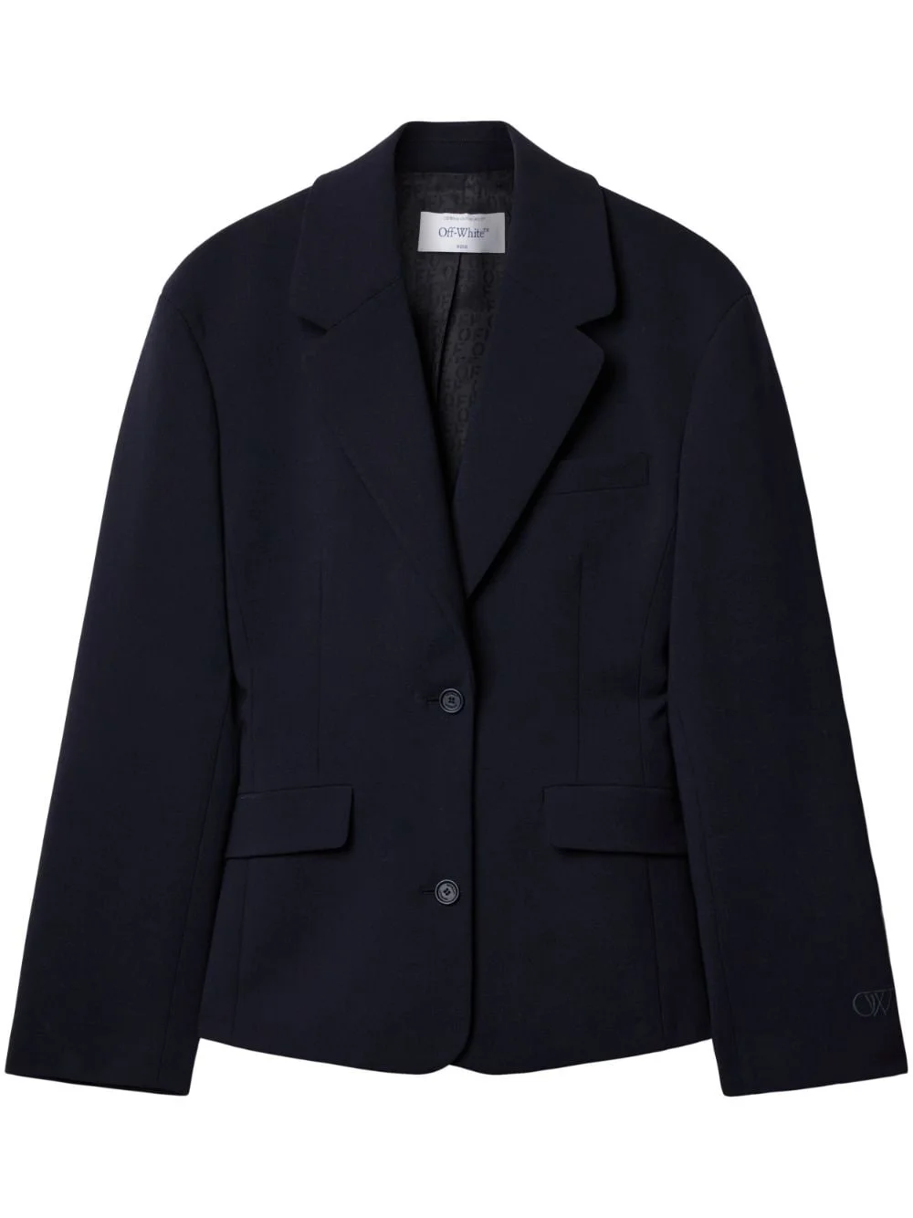 single-breasted structured blazer Off-White's penchant for geometric shapes is encapsulated with this midnight-blue blazer. Crafted from a virgin wool blend, it comes with structured shoulders that fall to a sculpting hourglass silhouette that emphasises the figure, while honouring the brand's aesthetic. Highlights - Midnight blue - Virgin wool blend - Notched lapels - Front button fastening - Shoulder pads - Two front flap pockets - Long sleeves - Buttoned cuffs - Straight hem Made in Italy Composition Wool 100%