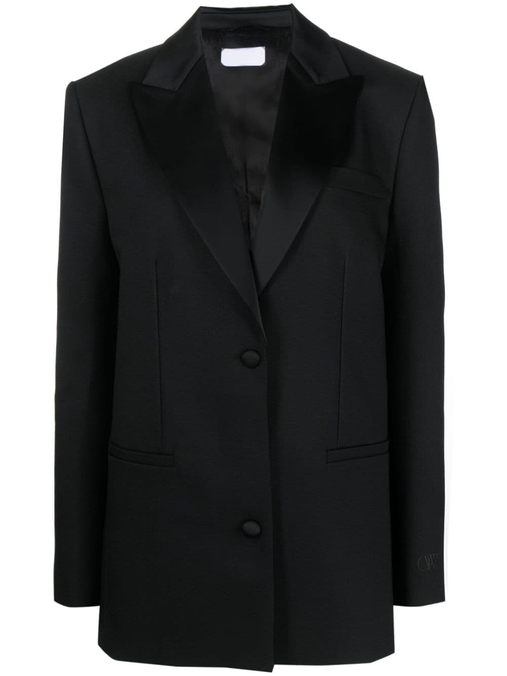 single-breasted tuxedo blazer Off-White showcases a traditional side to its aesthetic, presenting its take on the classic tuxedo jacket. Tailored in Italy, it boasts all the signature detailing, like the wide peak satin lapels. Highlights - Black - Satin trim - Wide peak lapels - Front button fastening - Dart detailing - Chest welt pocket - Two front jetted pockets - Long sleeves - Straight hem Made in Italy Composition Outer: Polyester 100%, Acetate 77%, Viscose 20%, Elastane 3% Lining: Viscose 100% SIZE & FIT Model measurements Height 5 ft 10 in(1.78 m) Bust/Chest 32.67 in(83 cm) Hips 35.43 in(90 cm) Waist 23.22 in(59 cm) Measurement SLEEVE LENGTH 24.8 in(63 cm) LENGTH 30.7 in(78 cm) FittingInformation Designed to be unstructured, offering a loose fit throughout The vented hem offers movement at the rear Made from a midweight non-stretch fabric This piece fits true to size – take your usual size
