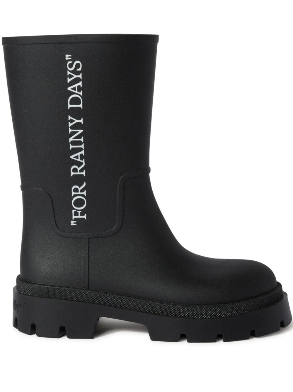 slogan-print boots Highlights - Black - Slogan print to the side - Round toe - Pull-on style - Mid-calf length - Rubber lug sole Imported Composition Outer: PVC 100% Lining: PVC 100%, Polyester 100%