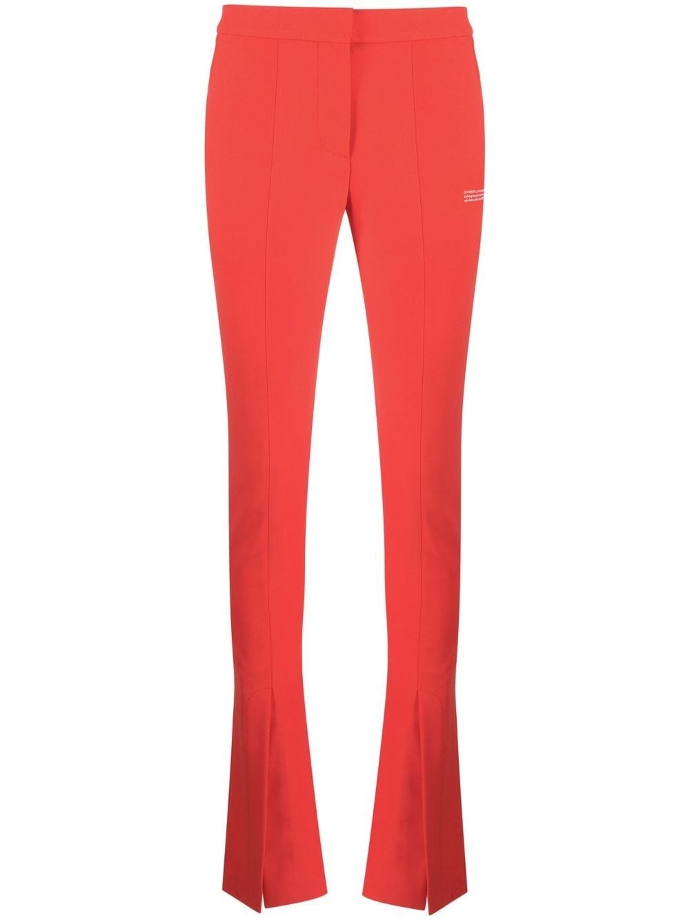 split-hem flared trousers Designed in a bold red hue and with a stretch construction, these tailored trousers encapsulate Off-White's statement streetwear aesthetic. Highlights - Bright red - Stretch-wool - Slogan print to the side - Mid-rise - Concealed front fastening - Two side slit pockets - Flared hem - Split cuffs - Floor-length Made in Italy Composition Outer: Recycled Polyester 53%, Virgin Wool 43%, Spandex/Elastane 4% Lining: Cotton 100% SIZE & FIT Model measurements Height 5 ft 10 in(1.77 m) Bust/Chest 32.67 in(83 cm) Hips 35.43 in(90 cm) Waist 23.62 in(60 cm) FittingInformation This piece fits true to size. We recommend you get your regular size Cut for a close fit Made with a mid-weight stretch fabric Washing instructions Dry Clean Only