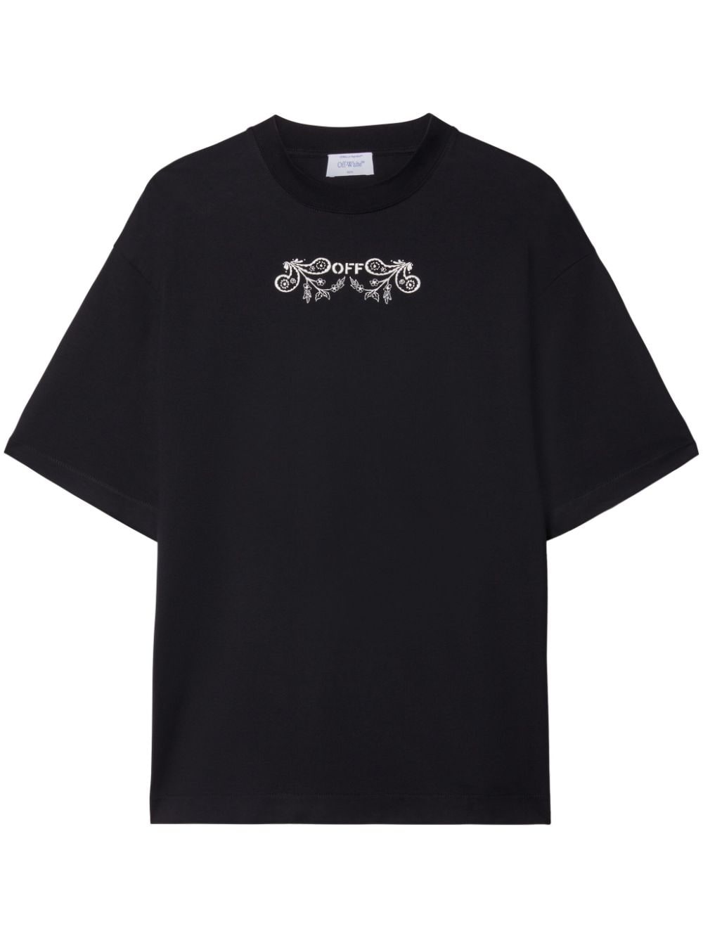 Tattoo Bandana Arrow-print T-shirt Taking a hint from skater culture, Off-White decorates this black cotton T-shirt with a bandana motif. It frames the brand's iconic logo, emblazoned across the front. Highlights - Black/white - Cotton - Bandana print - Logo print to the front - Crew neck - Short sleeves - Straight hem Made in Italy Composition Cotton 100% Washing instructions Read Manufacturer Guidelines