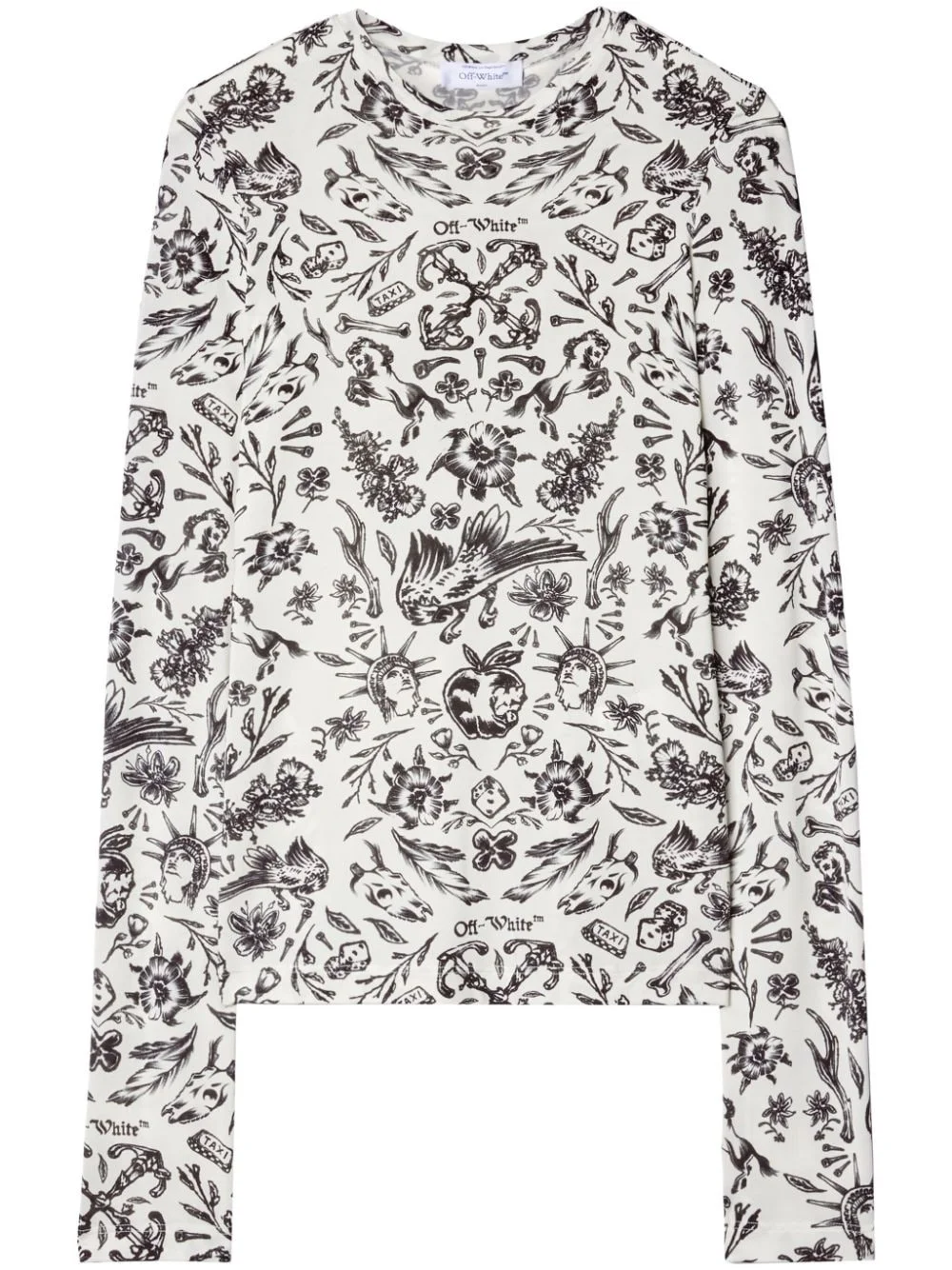 tattoo-print T-shirt Off-White's vision is a graphic one, and this white T-shirt is proof. Cut to a minimalist crew-neck silhouette, it is animated with an inky print starring a myriad of tattoo-like designs. Highlights - White/black - Tattoo print - Crew neck - Long sleeves - Straight hem Made in Italy Composition Viscose 96%, Elastane 4% Washing instructions Read Manufacturer Guidelines