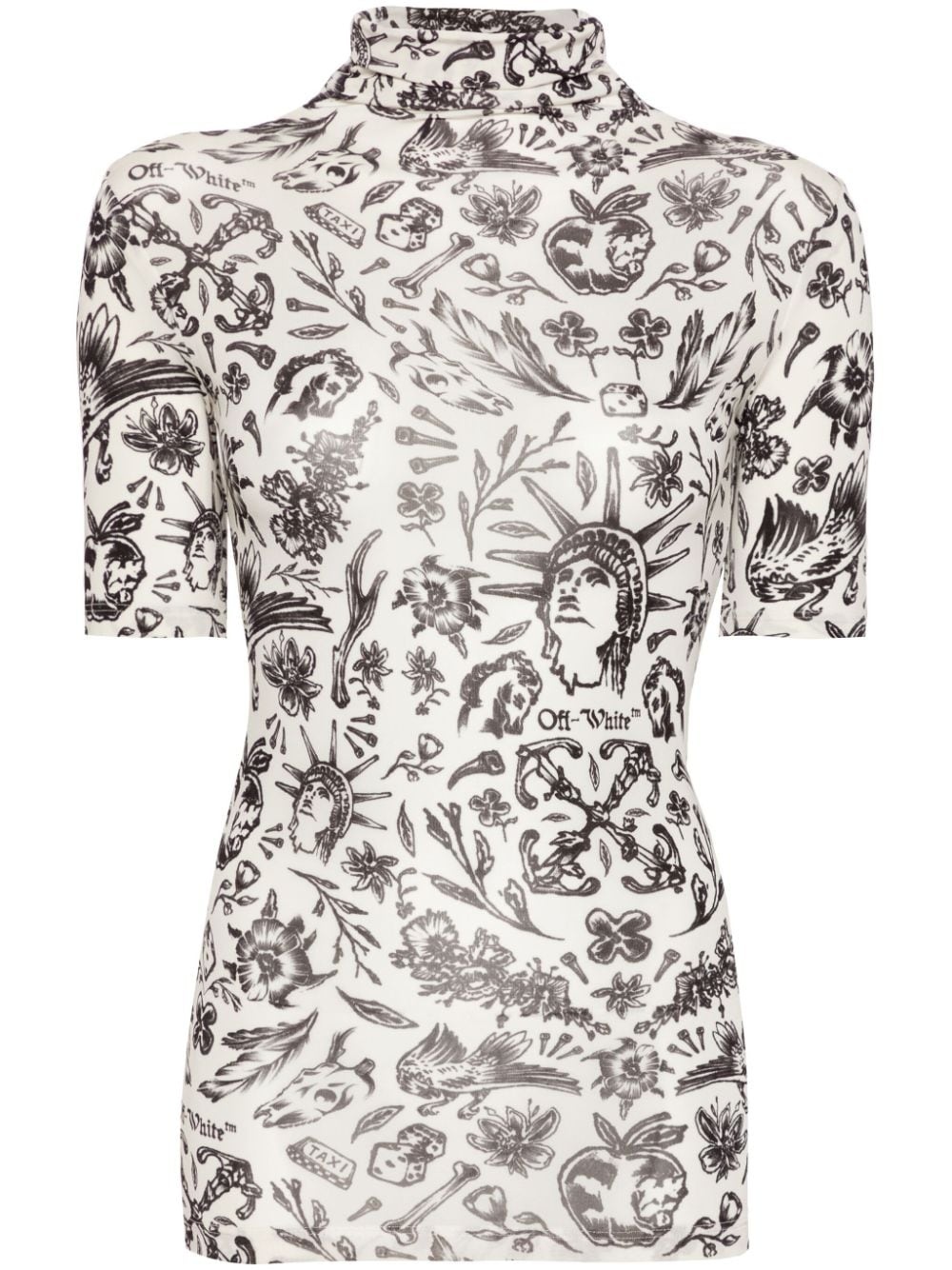 Tattoo tulle blouse Off-White's graphic vision is clear with this white top. Cut to a short-sleeve silhouette with a rolled neckline, it is animated with an inky print starring a myriad of tattoo-like designs that grants it its name. Highlights - White/black - Stretch-design - Tulle netting - All-over graphic print - Mock neck - Short sleeves - Straight hem Made In Italy Composition Viscose 96%, Elastane 4% Washing instructions Machine Wash