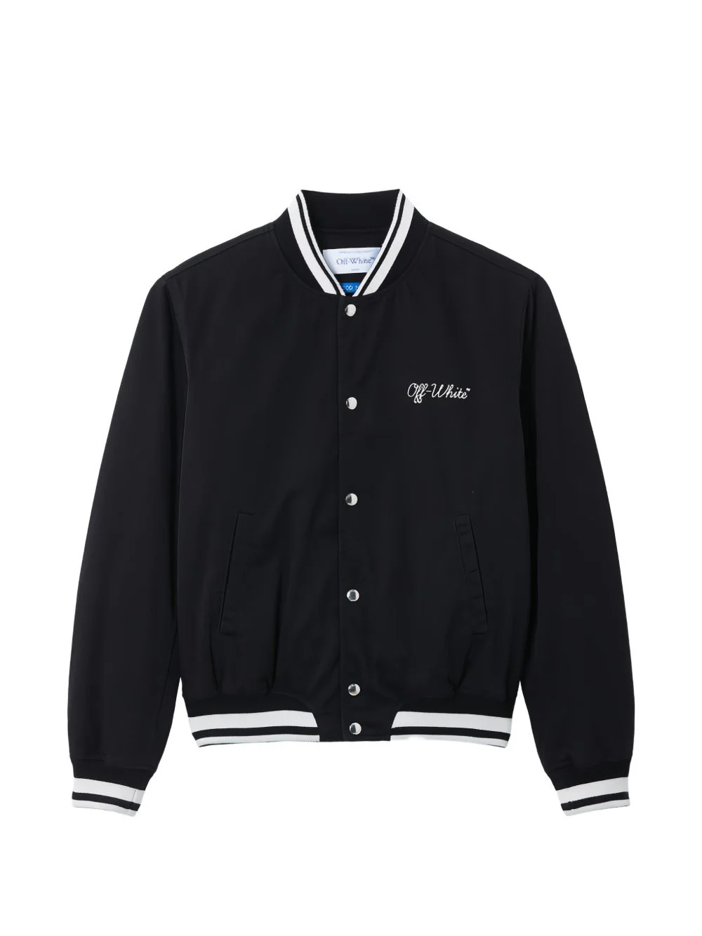 varsity bomber jacket Highlights - Black - White striped detailing - Front button fastening - Round neck - Long sleeves - Elasticated hem Made in Italy Composition Outer: Cotton 100% Lining: Viscose 100% Washing instructions Read Manufacturer Guidelines