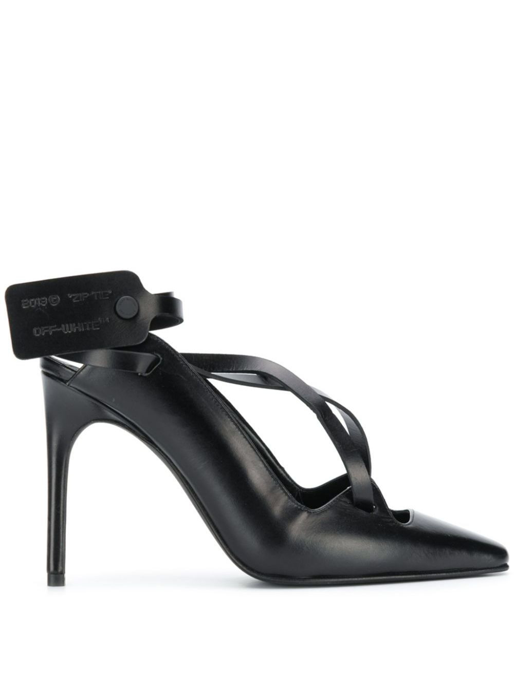 warped leather pumps Founded in 2013 by DJ and fashion designer Virgil Abloh, the Milan based fashion label Off-White was conceived to link the gap between streetwear and high fashion. These pumps are crafted from black leather in a warped style with an embossed tag at the ankle. Featuring a pointed toe, crossover straps to the front, an open back and a tag closure at the ankle. Made in Italy Composition Lining: Calf Leather 100% Outer: Calf Leather 100% Sole: Calf Leather 100% SIZE & FIT Measurement HEEL 4.33 in(11 cm) CIRCUMFERENCE 6.69 in(17 cm)