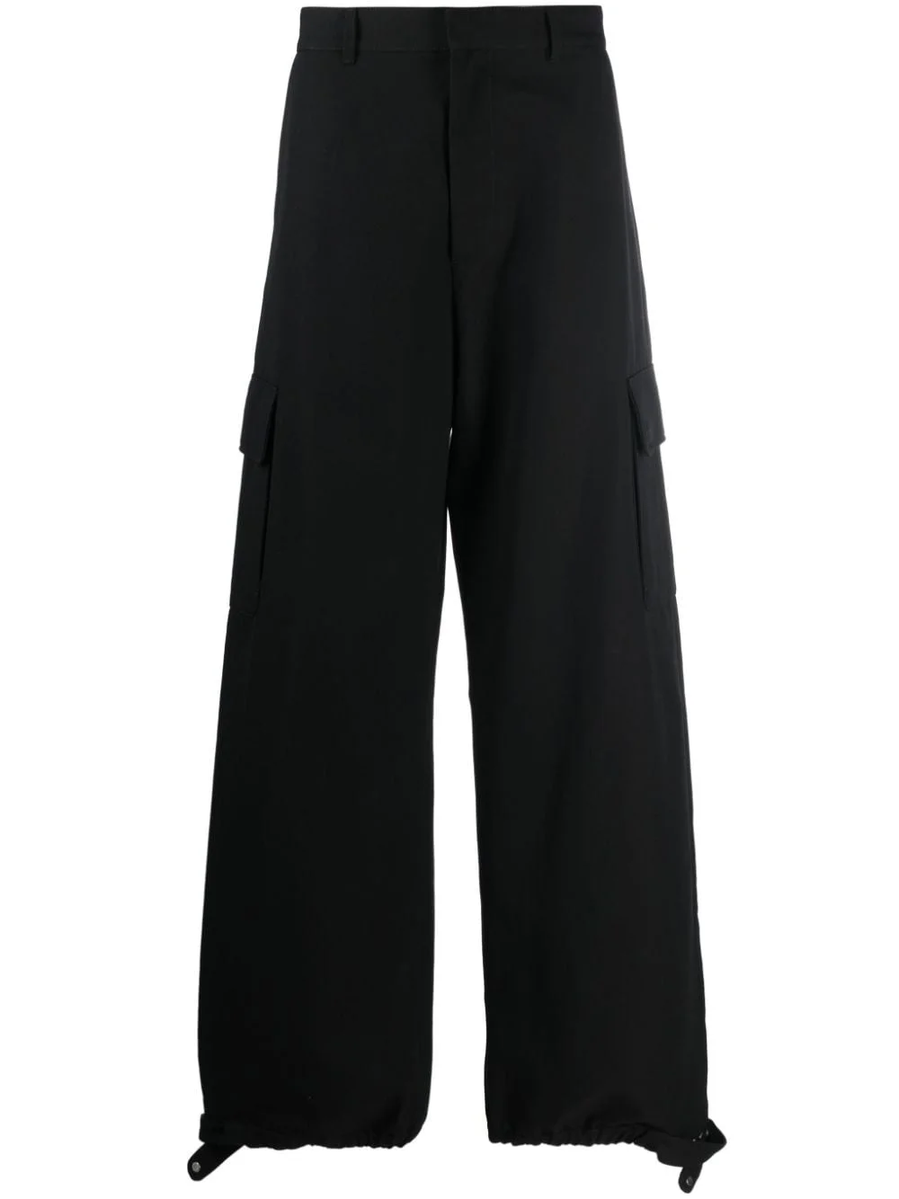 wide-leg wool-blend trousers Off-White sees these wool-blend trousers through a minimalist lens, presenting them in a classic black tone in a relaxed wide-leg silhouette. Highlights - Black - Wool blend - High waist - Belt loops - Concealed front fastening - Wide leg Made in Italy Composition Lining: Cotton 100% Outer: Wool 55%, Cotton 45% SIZE & FIT Model measurements Height 6 ft 2 in(1.89 m) Bust/Chest 35.03 in(89 cm) Hips 38.18 in(97 cm) Waist 29.92 in(76 cm) FittingInformation Designed with a wide leg, offering a loose and roomy fit Made from a midweight non-stretch fabric This piece fits true to size – take your usual size Washing instructions Dry Clean Only