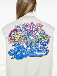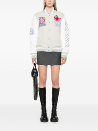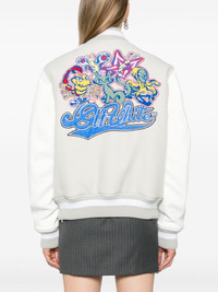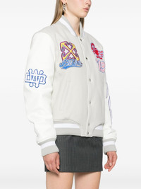 WO Varsity bomber jacket Highlights - Light grey/white - Wool blend - Leather panels - Panelled design - Ribbed band collar - Applique detailing - Signature arrows motif - Long sleeves - Chenille logo patch - Ribbed cuffs and hem - Embroidered logo to the rear - Embroidered motif - Straight hem - Internal slip pocket - Internal patch pockets - Logo-jacquard lining - Front press-stud fastening Imported Composition Outer: Leather 100%, Virgin Wool 75%, Polyamide 25% Lining: Viscose 100%, Cotton 100%, Polyester 100% SIZE & FIT Model measurements Height 5 ft 11 in(1.8 m) Bust/Chest 32.67 in(83 cm) Hips 36.22 in(92 cm) Waist 25.19 in(64 cm) FittingInformation Designed to be unstructured, offering a loose fit throughout The ribbed hem offers a close, comfortable fit Made from a padded non-stretch fabric, giving it no natural elasticity This piece fits true to size – take your usual size