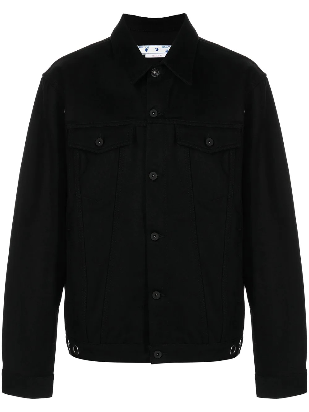 x Neen embroidered denim jacket Off-White presents this black denim jacket in collaboration with Chicago-based street artist Neen. Blending a workwear aesthetic with their mutual appreciation for cutting-edge street style, the piece features Neen's contrasting green embroidery to the rear. Made In Italy Composition Body: Cotton 100% SIZE & FIT Model measurements Height 6 ft 2 in(1.88 m) Bust/Chest 38.18 in(97 cm) Hips 37 in(94 cm) Waist 29.92 in(76 cm) FittingInformation This piece fits true to size. We recommend you get your regular size Cut for a relaxed fit Made with a heavyweight non-stretch fabric Washing instructions Machine Wash