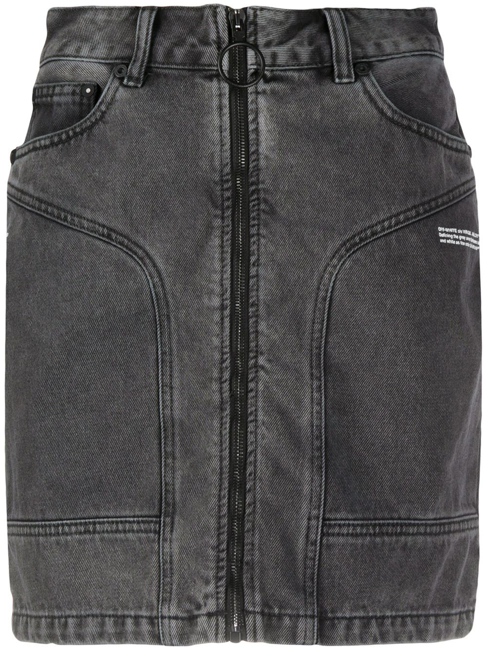 zip-front denim skirt Life is not just black and white and Off-white is helping us define the grey area in between. Opt for this dark grey cotton denim skirt and read the slogan for yourself, printed to the front. Featuring a front zip fastening, two front pockets, a slogan detail, belt loops and a branded rear patch. Made in Italy Composition Outer: Cotton 100% Lining: Polyester 65%, Cotton 35% SIZE & FIT Model measurements Height 5 ft 10 in(1.78 m) Bust/Chest 33.07 in(84 cm) Hips 36.61 in(93 cm) Waist 24.8 in(63 cm) Washing instructions Hand Wash