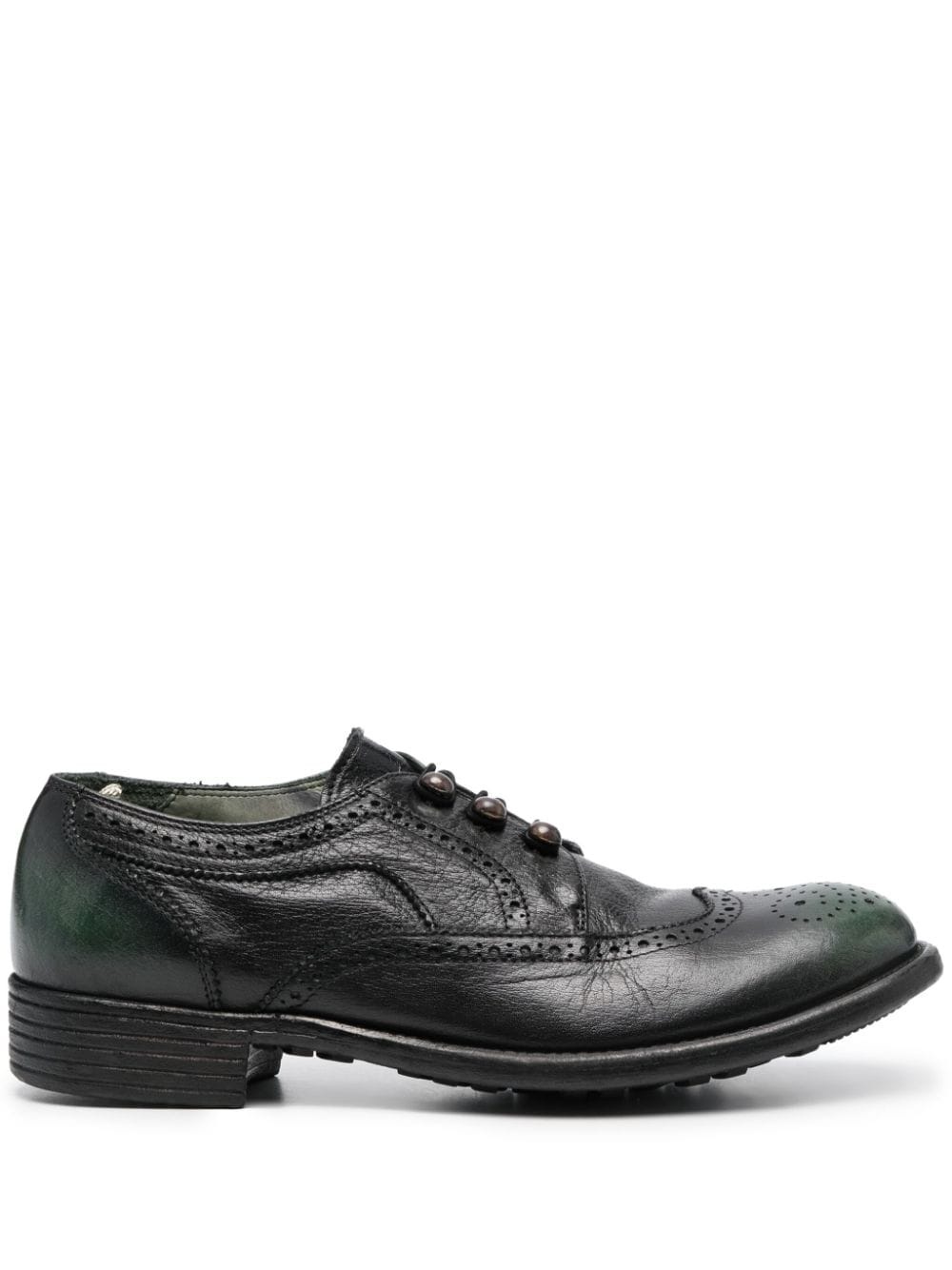 Calixte 035 perforated leather oxfords Highlights - Jet black/green - Calf leather - Smooth grain - Perforated detailing - Branded insole - Almond toe - Front button fastening - Low block heel - Flat sole Made in Italy Composition Outer: Calf Leather 100% Sole: Calf Leather 100%, Rubber 100% Lining: Calf Leather 100% SIZE & FIT Measurement HEEL 1.18 in(3 cm) Sole height 0.39 in(1 cm)