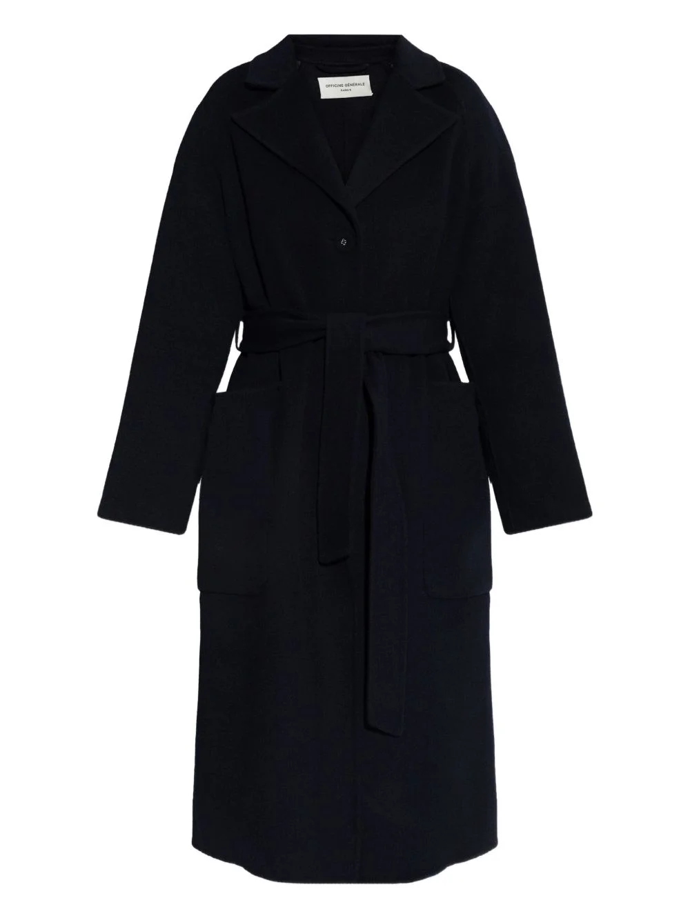 belted wool coat Highlights - Navy blue - Belted waist - Front pockets - Button fastening - Notched collar - Long sleeves Imported Composition Wool 100% Washing instructions Read Manufacturer Guidelines