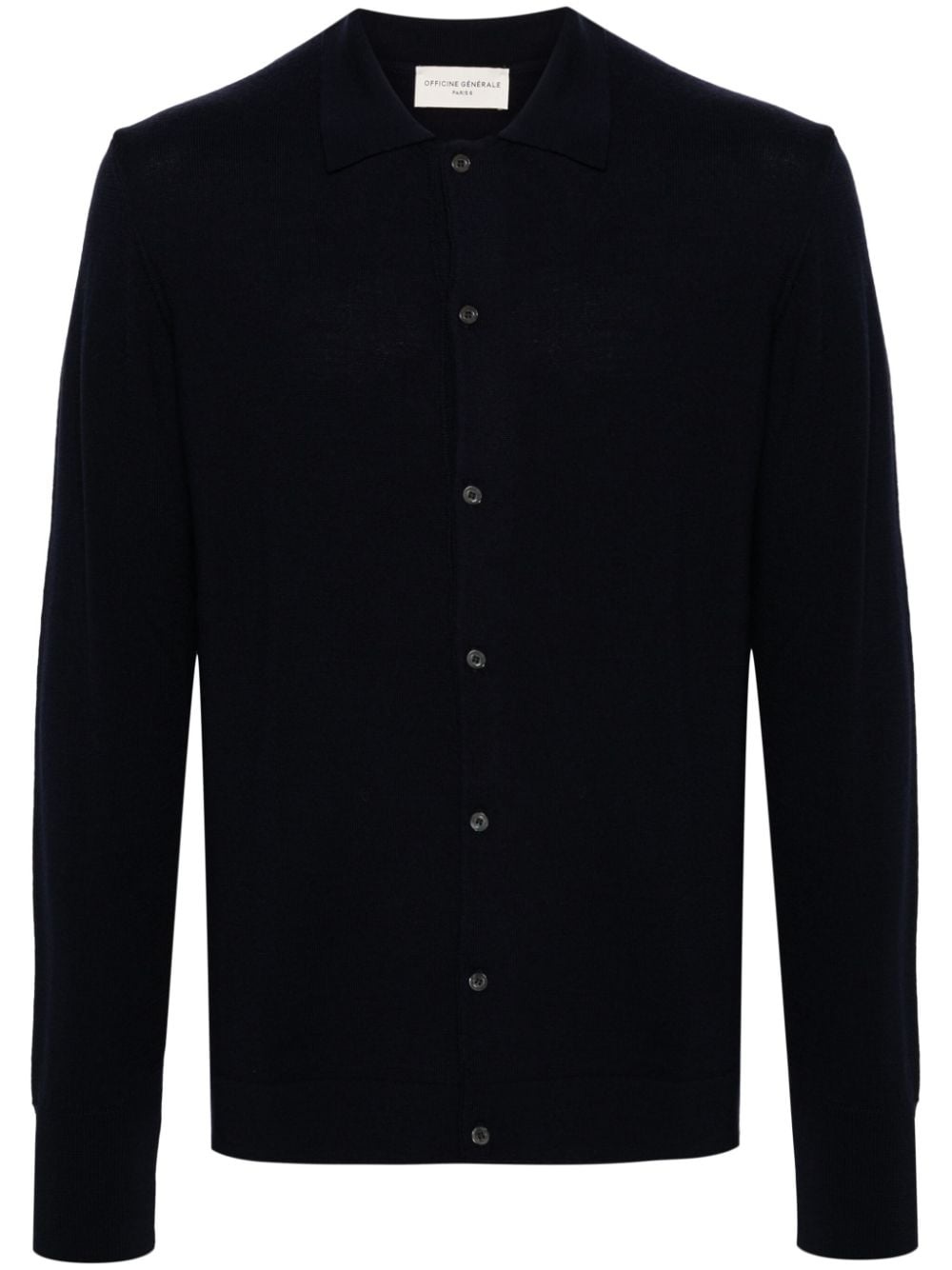 long-sleeve wool cardigan Highlights - Navy blue - Merino wool - Fine ribbed - Classic collar - Long sleeves - Ribbed cuffs and hem - Front button fastening Made in Italy Composition Merino 100% SIZE & FIT Model measurements Height 6 ft 2 in(1.89 m) Bust/Chest 37.4 in(95 cm) Hips 35.03 in(89 cm) Waist 27.95 in(71 cm) FittingInformation Designed for a slim fit, offering a comfortable fit that sits just away from the body Made from a midweight non-stretch fabric, this piece offers minimal elasticity when worn This piece fits true to size – take your usual size