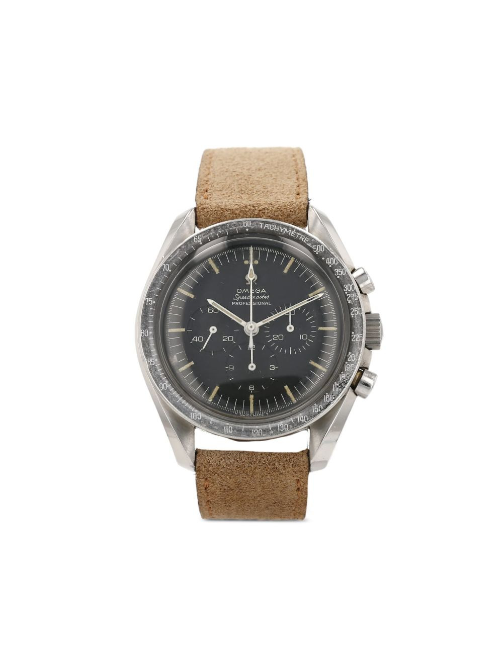 1965 Speedmaster Professional 42mm Highlights - 1965 - Black dial - Stainless steel case - Round case shape - 42mm case size - Tachometer bezel - Three chronograph sub-dials - Manual-winding movement - Screw-in crown - Condition: good. this previously owned and used item is in good condition with minimal signs of use. this may include fading of material or plating and scratches. - This item comes with a standard one-year warranty from the boutique. - This item comes with a collector square certificate of authenticity. Imported Composition Leather 100%, stainless steel 100% SIZE & FIT Measurement DIAMETER 1.65 in(4.2 cm)